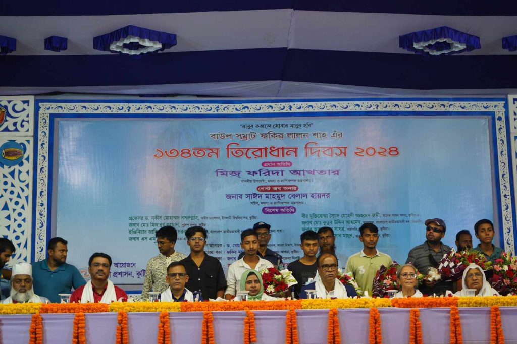 লালন আমাদের শিখিয়েছেন, কিভাবে প্রকাশ করতে হয় যে, আমি কিছু না। লালন শুধু কুষ্টিয়ার নয়, লালন সারা বাংলাদেশের, লালন সারা বিশ্বের।” “মানুষ ভজলে সোনার মানুষ হবি” বাউল সম্রাট ফকির লালন শাহ এঁর এই আধ্যাত্মিক বাণীর শ্লোগানে ১৩৪তম তিরোধান দিবস উপলক্ষ্যে লালন একাডেমির সভাপতি ও কুষ্টিয়ার ভারপ্রাপ্ত জেলা প্রশাসক মোছা. শারমিন আখতার এর সভাপতিত্বে মৎস ও প্রাণী সম্পদ উপদেষ্টা ফরিদা আখতার এই উৎসবের উদ্বোধন করেছেন।